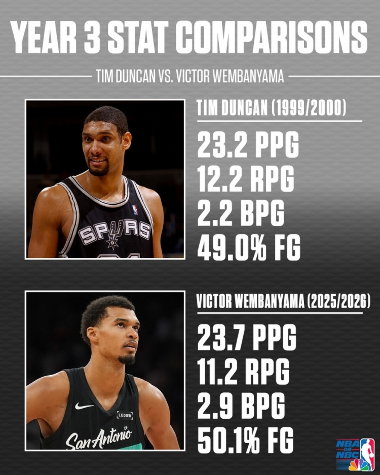 世界杯直播软件-文班&邓肯生涯第3年数据对比!邓肯23+12+2 文班23+11+3